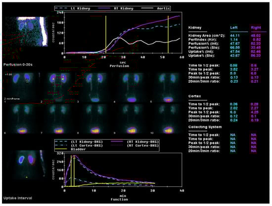 All the study participants underwent ACE inhibitor renography using the radiopharmaceutical 99 mTc-MAG3 (Figure 3) by the consensus report on ACE inhibitor renography guidelines to identify renovascular hypertension [20]. All the patients were instructed to discontinue their ACE inhibitor medication three days before the scan to prevent potential interference with the results. Renal scintigraphy analysis involved the generation of time–activity curves by designating a region of interest (ROI) over each kidney, including the background area, and delineating the aorta. Renal perfusion assessment entailed visual and quantitative analyses of the initial radiopharmaceutical bolus as it passed through the abdominal aorta and into the renal arteries. The relative renal function was evaluated based on the time–activity curve data, focusing on the relative radiopharmaceutical uptake. The Tmax, or time to the peak, was calculated from the radiopharmaceutical injection moment to the peak of the renogram curve. The 30 min/peak ratio, indicative of the renal transit time and parenchymal function, was determined by comparing kidney counts at 30 min post injection to peak counts obtained during the scintigraphy. The T½, or time to the half-peak, was measured from the peak counts to when the renogram curve reduced to half its maximum. Furthermore, the ratio of the whole kidney ROI counts at 20 min to those at 3 min (20 min/3 min ratio) was computed, serving as an essential metric for concurrently evaluating renal clearance and excretion [21]. All the diagnostic evaluations were completed within two months, ensuring a minimum interval of two weeks between each patient’s CT and renal perfusion scans.