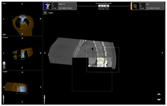 Segmentation of the herniated disc was usually manually performed in the CT and T2-weighted MRI modality (Brainlab). Vertebrae and discs were segmented automatically using CT data, with manual correction or segmentation from MRI data. The spinal cord was segmented using MRI data in a T2-weighted modality. Implants were segmented by intensity thresholding. Following iCT, elastic and rigid fusion of the preoperative and postoperative imaging was performed (Figure 3). A registration accuracy check was performed on the skin fiducials, bony landmarks, and on the retractor. A control-iCT scan was performed for control of the extent of the resection and navigation update.