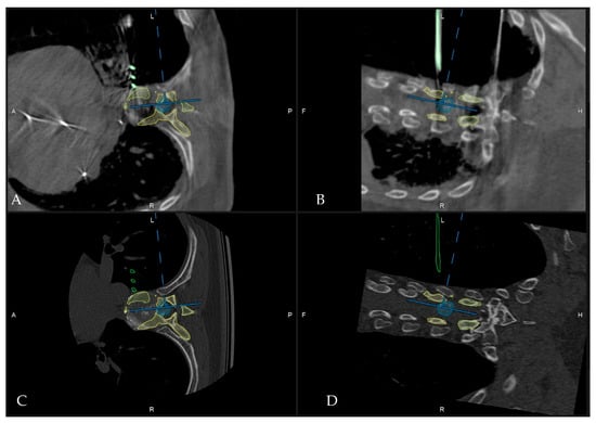 Patient No. 2 underwent a two-stage surgery for a large calcified herniated disc Th11/12 with myelopathy. Dorsal stabilization of Th10–11 with decompression was performed, followed by a non-navigated resection of the herniated disc through a left transpleural approach. Follow-up CT and MRI showed incomplete resection, so a navigated resection with iCT and AR via a left transpleural approach was performed (Figure 5). In this case, the reference array was placed at the iliac crest. This patient underwent two revision surgeries: one for hematothorax on the first postoperative day, and one further revision surgery due to wound healing deficit. The patient recovered and had neurological improvement, with slight paraparesis and ataxia at follow-up.
