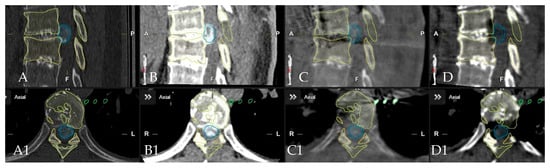 Patient No. 3, depiction of segmented vertebras in yellow and herniated disc in blue in preoperative (A,B) sagittal and (A1,B1). Axial CT with same segmented structure in intraoperative, control iCT scan following complete resection of the disc in (C,D) sagittal and (C1,D1) axial view.