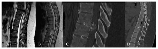 Compared to other localizations in the thoracic spine, disc herniations tend to calcify, and are more often located centrally []. Specific anatomical characteristics of the thoracic spine and the course of the thoracic cord and its vasculature are vital for understanding the symptoms []; the kyphosis of the spine makes the cord closer to the posterior side of the vertebral body so that the movement of the cord is limited. Furthermore, thoracic spinal nerve roots are tethered by the dentate ligament, which makes the cord prone to the anterior impingement [,]. Further factors which make the thoracic cord more vulnerable in case of a thoracic disc include a narrow spinal canal as well as the presence of the so-called “watershed zones”, which are areas of impaired blood supply [,]. Calcification of the nucleus pulposus in the intervertebral disc is the important radiological feature []. There are three types: calcium-ringed lesions, heterogeneous calcification lesions, and homogeneous calcification lesions [].