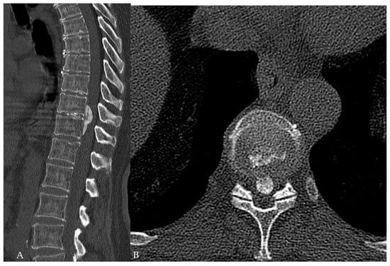 Calcified hernias that fill >40% of the spinal canal are called giant thoracic disc herniations, and they usually result in myelopathy with associated neurologic symptoms. There is controversy about the surgical approach to the treatment for this pathology [,]. Calcified discs are usually visualized using computer tomography (CT) or CT-myelography as large osseous masses protruding into the spinal canal from the posterior edge of the adjacent thoracic vertebra. Preoperative magnetic resonance imaging (MRI) does not always show that the lesion in calcified. An anterior approach (minithoracotomy or thoracoscopic approach), i.e., the lateral approach to the spine, reduces the risk of spinal cord injury. However, a risk of damage to the lungs, pleura, and major vessels exists []. Large size and ossification and calcification of the thoracic discs make the treatment challenging, with further limitations being the scarce literature on the subject, which relies mostly on retrospective studies or small case series []. Technical challenges of the surgical treatment include the location of the disc, calcification and ossification with a restricted overview of the ventral cord, and characteristic blood supply to the thoracic cord []. The anterior transthoracic approach has the advantage of avoiding manipulation of the compressed spinal cord by reaching the herniated disc in front of it []. Approximately 4% present with myelopathy [].