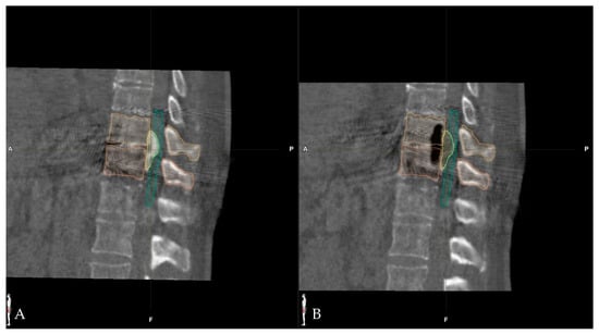 Patient No 5. sagittal view of (A) registration scan iCT prior to resection and (B) control iCT scan, which depicts the complete resection of the disc. Vertebras are segmented in orange, the disc in yellow, and the dural sac in green.