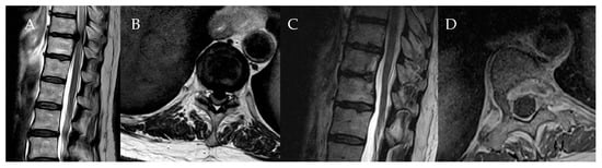 Patient No. 5. Preoperative T2-weighted (A) sagittal and (B) axial MRI with postoperative T2-weighted (C) sagittal and (D) T1-weighted post-contrast axial MRI of the thoracic spine, which shows the complete resection of the herniated disc.