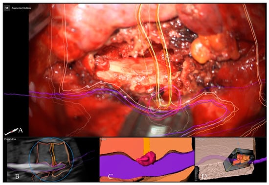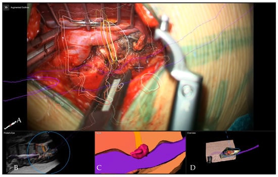 Correct patient registration and correct microscope calibration are prerequisites for the correct visualization of the objects in the surgical field []. An increase in the comfort of the surgeon during the procedure, especially in re-operations, and the display of the size of the object and its relation to the surrounding structures, as well its role for educational purposes, are all described as advantages of AR []. Identification of the parts of the vertebra when they are not in the field of view increases confidence in the resection of the tissue, with a clear differentiation of the previously segmented herniated disc from the surrounding objects by color [].