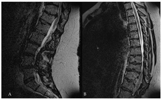 Patient No. 6. A. Preoperative T2-weighted sagittal MRI of the lumbar spine shows the herniated disc at Th11–12 level, with (B) the postoperative sagittal T2-weighted MRI of the thoracic spine, which shows the complete resection of the disc.
