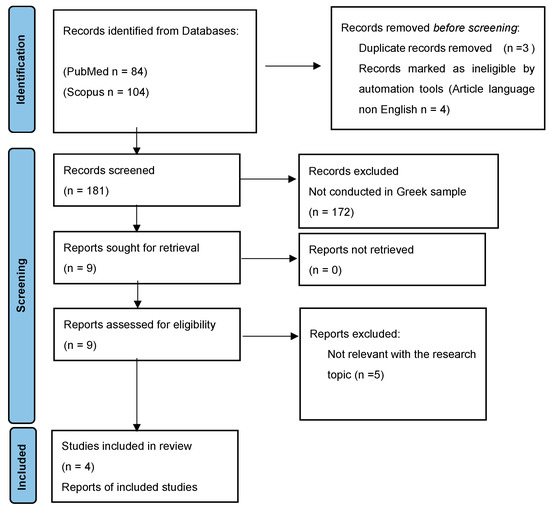 Following database screening, 84 Scopus and 104 PubMed titles and abstracts were reviewed to verify the inclusion criteria. An additional literature search was conducted for related references included in the manuscripts. After three duplicates were removed, the suitability of the scanned abstracts was assessed by two independent individuals. Then, the full texts were retrieved and read, ensuring that they met the eligibility criteria for this review. Conflicts were resolved after a broad discussion between the authors. Following this, the results of the studies were compiled and presented in tables. Mendeley reference manager software 2.114.0 was used to remove duplicates. A total of 9 articles were obtained from the search procedure, while 172 articles were excluded as the research was not conducted in a Greek sample.