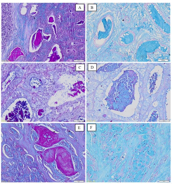 The localizations of AB, PAS, and AF were examined under a virtual microscope (Olympus 534630, Hamburg, Germany) and the images were captured by using a digital microscope (Olympus BX51, Hamburg, Germany) at a high resolution of 4080 × 3072 pixels. Tumour tissue from biopsied specimens was entirely utilized while tissue from surgical specimens, a few different sections, were evaluated before selecting a final suitable representative section. Distribution of the stains within the tumour microenvironment was assessed, with the findings recorded as (+) indicating the presence of stain and (−) indicating the absence of stain. A semi-quantitative approach was used to further evaluate the expression of mucin within the ductal lumens. This approach was considered due to the categorical data nature of the percentage of surface areas highlighted by the special stains. For each sample, the entire surface area of the tumour microenvironment was examined under 20× to 100× magnifications using Toupview software (Version: V3.4_20230223) to assess the percentage of stains within lumens of ductal structures. Intra-examiner and inter-examiner calibrations involving three examiners were conducted and verified to minimise discrepancies. To avoid the possibility of inaccurate scoring, areas of intense inflammation and necrosis were excluded. The extent of scoring was categorized as follows: 0, less than 25% of surface area positivity; 1, 25–50% of surface area positivity; 2, 50–75% of surface area positivity and 3, more than 75% of surface area positivity. The scoring was further classified into two as follows: less than 50% of surface area positivity and more than 50% of surface area positivity.