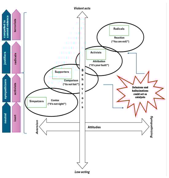 Radicalization is a complex process in which people become motivated to use violent acts against members of other groups or specific targets in order to achieve social or political changes [1,2]. Being a complex phenomenon, many theories, stages, and factors have been proposed [3,4]. According to Misiak et al. (2019), radicalization is a process by which individuals adopt political, social, and religious ideation that leads to the initiation of mass violence acts [5], while Shmid et al. (2013) define radicalization as “both an individual and group process, whereby political actors and groups that are politically polarized renounce dialogue, agreement, and tolerance and use either non-violent pressure and coercion, or various forms of political violence including violent extremism (terrorism and war crimes)” [6]. The European Commission defines violent radicalization as the phenomenon of people embracing opinions, viewpoints, and ideas that might lead to terrorist acts [7].