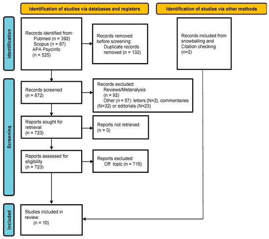 Based on our search strategy, 1004 papers were identified, 132 of which were duplicates and were removed. Among the remaining articles (N = 872), 149 articles were excluded by reading titles and abstracts, and 723 papers were evaluated as full-text. Eight studies matched the inclusion criteria and were included in the review, while two additional papers were included by snowballing and citation checking [41,42]. The selection process is summarized in Figure 2.