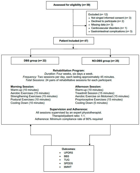 In the study, eligible patients were systematically divided into two different groups: the DBS Group and the no-DBS Group. This categorization was performed by the presence or absence of DBS. Both groups underwent the same inpatient rehabilitation program specifically designed for patients with PD.