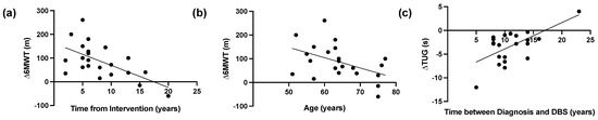 The following supporting information can be downloaded at: https://www.mdpi.com/article/10.3390/medicina60060927/s1, Table S1: Correlation analysis between Age and and 6-minute walk test (6MWT), Timed Up and Go (TUG), Time from Intervention, and Time between Diagnosis and DBS.