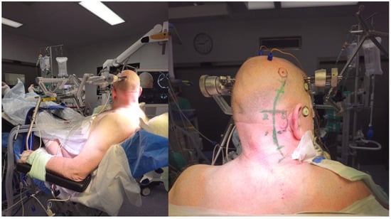 Operative setting. Patient is positioned in the sitting position, with the head tilted to the side of the lesion (Patient No. 43). Registration array is attached to the Mayfield clamp and is positioned to the right. Fiducial-based registration is performed prior to skin incision.