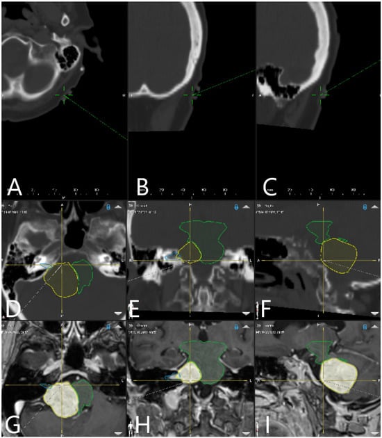 Patient No. 34. Preoperative MRI with segmented objects of interest was fused with preoperative navigation-CT with fiducials. Registration accuracy check on skin fiducial in (A) axial, (B) coronar and (C) sagittal view. Segmented objects of interest (tumor outline in yellow and brain stem in green) are presented in (D) axial, (E) coronar and (F) sagittal CT, as well as in (G) axial, (H) coronar and (I) sagittal T1-weighted post-contrast MRI.