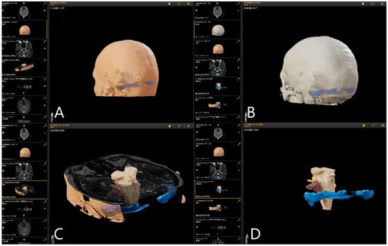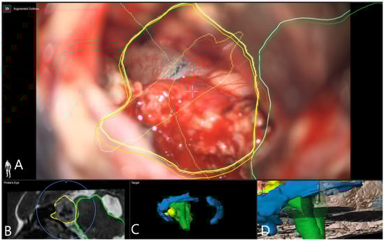 Besides its use in the operative room, AR has shown value as a training tool for the education of residents and young neurosurgeons in skull base surgery []. For educational purposes, Carlstrom et al. designed, from a skull base tumor registry, 3D models using high-resolution preoperative CT and MRI images, which were rendered for three possible surgical approaches following the uploading of 3D modeling data to an open-source database for virtual/augmented reality []. Surgical approaches such as mastoidectomy, anterior clinoidectomy and anterior petrosectomy were included in a training program using 3D-printed models with an AR system [].