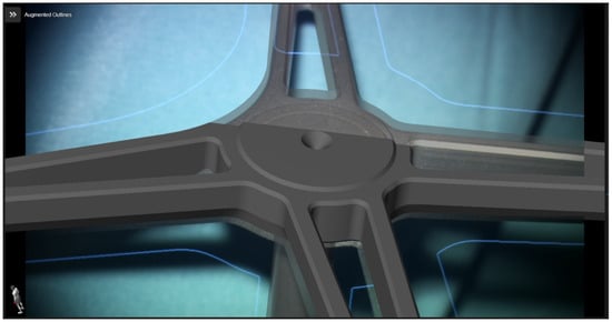 Following retrosigmoid craniotomy, calibration of the microscope was performed (Figure 4). For AR support, the HUDs of the operating microscopes (Pentero 900 (Zeiss, Oberkochen, Germany) or Kinevo 900 (Zeiss, Oberkochen, Germany)) were used. Tracking of the microscope was performed by a registration array attached to the microscope. Checking the calibration of the AR was performed by centering the microscope above the divot of the registration array, as well as additional markers. In this way, the optical outline and the AR visualization of the reference array could be adjusted, 3D objects could be visualized in semitransparent, solid or outlined mode using the AR display, and the microscope application allowed for visualization of these objects in different modes on the microscope video.