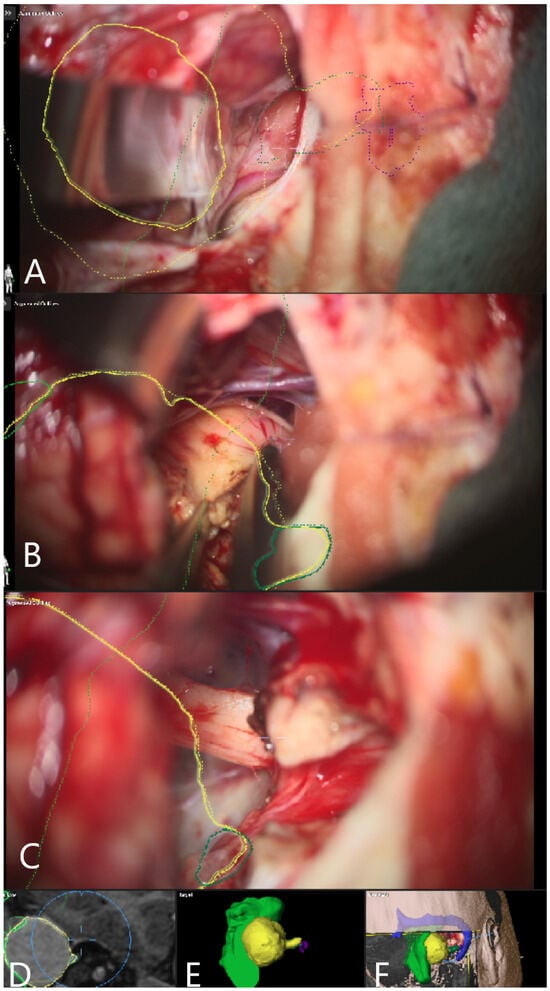 AR systems in cranial neurosurgery are designed to project 3D images of cerebral anatomy onto the real operative field, with superimposition of the images in a microscope (alternatively, a head-up display), without obstruction of the view, which assists by improving navigation and planning of the procedure, and leads consequently to a reduction in the operative time []. Surgical planning, localization of the brain structures, resection guidance and trajectory planning in neurovascular and neurooncological surgery have been previously described []. Craniotomy planning in skull base surgery is enabled through projections of the segmented structures of interest on the skin surface []. Retrosigmoid craniotomy planning was described in a cadaveric study [], with projection of outlines of the dural sinuses on the skin and tailoring of the craniotomy. A recent literature review on the use of AR in skull base surgery identified nine clinical studies with 292 patients which thematized the use of this technology []. The primary data source was CT with optical tracking as the main modality (each 47.4%) and target registration error (TRE) which spanned from 0.55 to 10.62 mm []. Feasibility studies for AR use in lateral skull base surgery, which included the creation of a head-up display platform which allowed manual alignment of incorporated fiducial markers in real-time on a phantom model of a temporal bone using only CT rendering in the AR environment, were published in 2020 []; however, although AR visualization of CT could be transferred to surface landmarks of the patient, the target registration error was too high for proper use in surgery. However, Oemke et al. [], using the same Brainlab software (Brainlab cranial software, 2019) as was used in this study, described safe and effective use of AR for the resection of tumors of the cerebellopontine angle, including ANs []. Schwam et al. [] emphasized the value of AR in the preparation and approach planning for surgery of the cerebellopontine angle. Apart from segmentation of the tumor, the facial nerve, as well as the vestibulocochlear nerve, were labeled on preoperative imaging; however, due to tumor mass effect, there was a high possibility of an error in the labeling process due to overcrowding of these structures near the brain stem and in the internal auditory canal []. Incorrect segmentation and labeling of CN VII could be detected throughout the surgery using nerve stimulation []. Due to this described possibility of incorrect segmentation and the close proximity of CN VII and CN VIII in the cerebellopontine angle, we did not perform segmentation of a complete portion of these nerves but rather only their origin at the brain stem, and then intraoperatively detected CN VII using standard direct nerve stimulation. Identification of CN VII is possible in the internal auditory canal following its unroofing. Possible brain shift which occurs following cerebellar retraction and CSF release could be compensated and corrected on rigid bony structures of the lateral skull base, which can be used for navigation update []. Figure 18 and Figure 19 demonstrate AR-facilitated localization of CN VII and VIII origin at the brain stem.