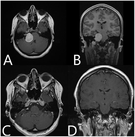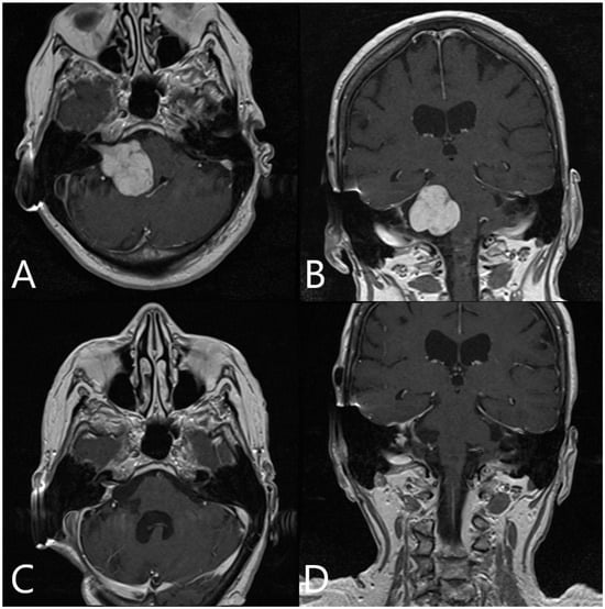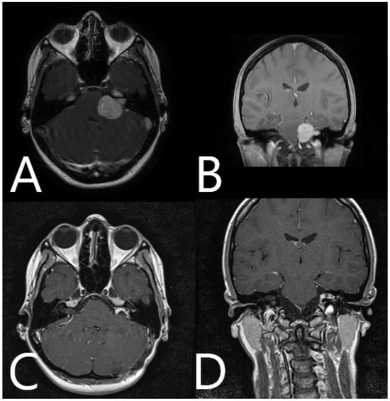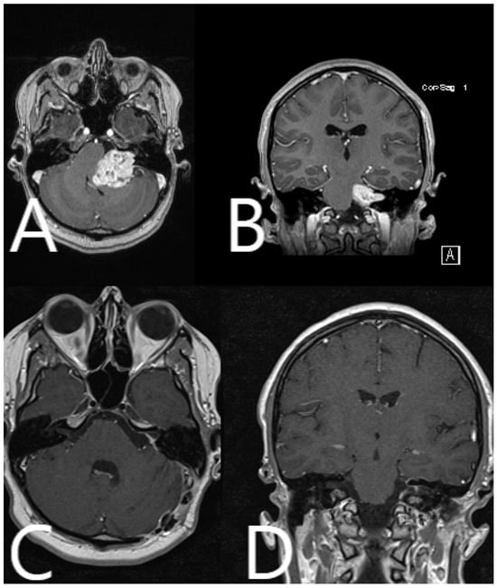 Patient No. 40. Preoperative (A) axial and (B) coronar T1-weighted post-contrast MRI with postoperative (C) axial and (D) coronar T1-weighted post-contrast MRI, depicting subtotal resection of the tumor and slight contrast enhancement along the course of the facial nerve.