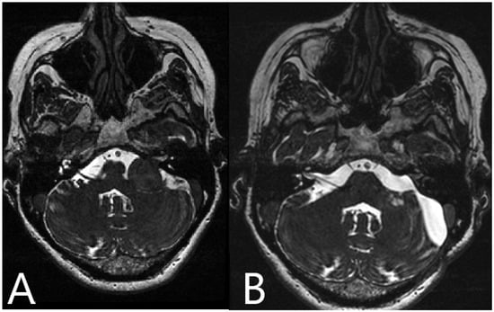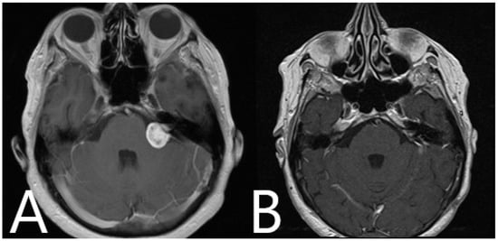 Patient No. 39 (same patient as in Figure 3) was a 72-year-old female patient who presented with complete hearing loss and headache. MRI revealed a T2 AN on the left side. She underwent STR of the tumor (Figure 10 and Figure 11).