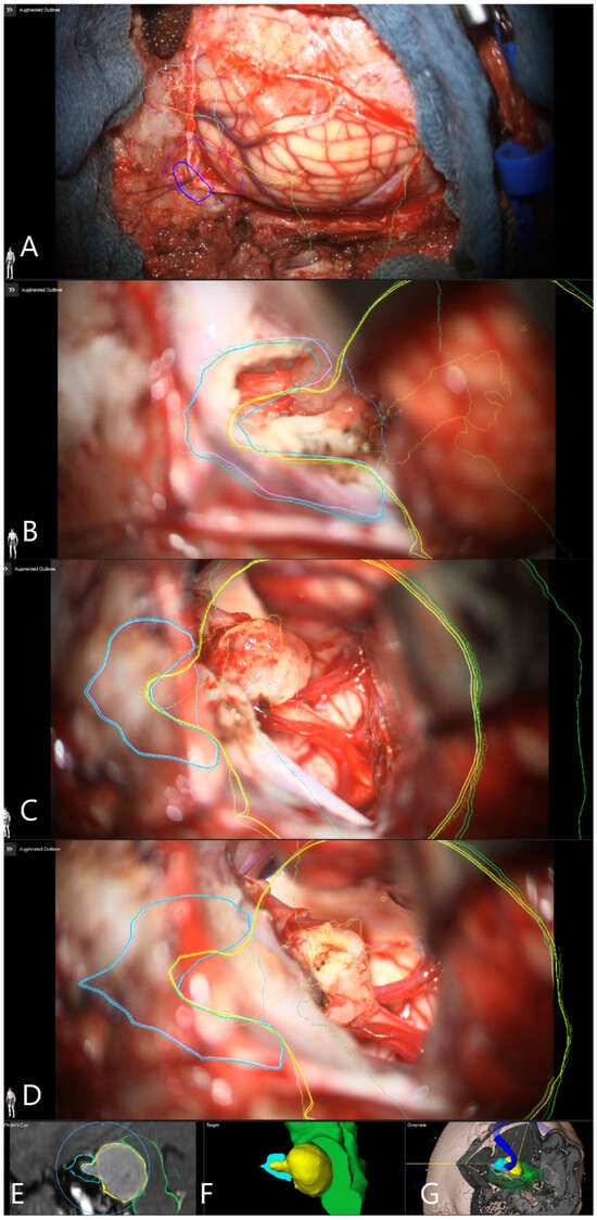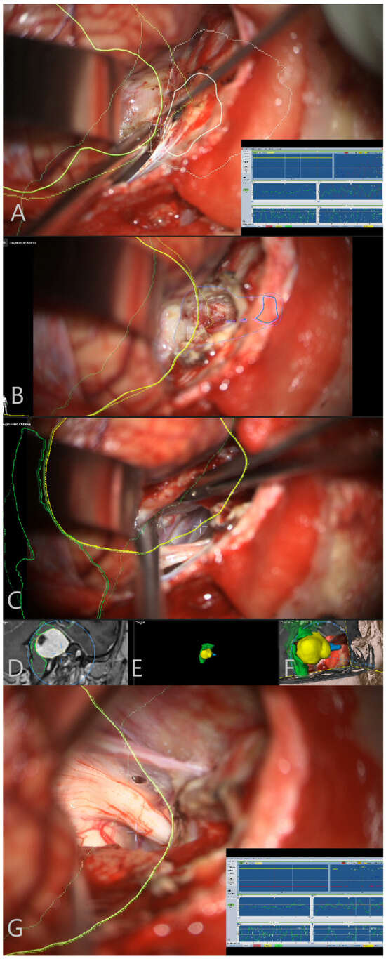 Patient No. 38. AR display on video screen with the 3D outline of tumor (yellow), brain stem (green), venous sinus (blue) and internal acoustic meatus (light blue) (A) following dural opening, (B) initial exposure of the tumor, (C) throughout the resection of the tumor with smaller remnant and (D) following resection of the tumor with small remnant on the facial nerve. Tumor remnant was left due to adherence to facial nerve and in order to preserve its integrity and function. (E) Corresponding probe’s eye view. (F) Target view (tumor and further objects outside of the focus plane are visualized) and (G) overview video plane in relation to the 3D objects.