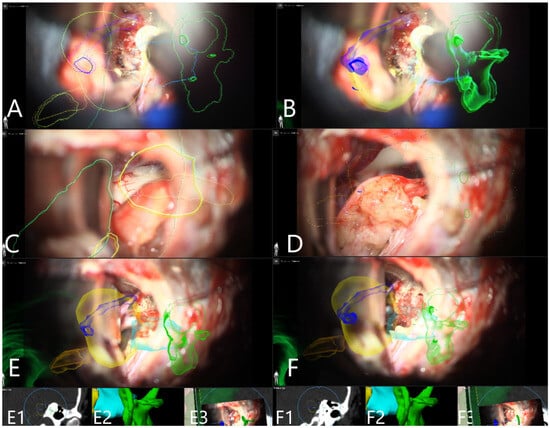 (A) AR display on video screen with the outline of tumor (yellow), petrous vein (blue), semicircular canals (green), CN VII/VIII complex origin at brain stem (orange) and internal acoustic meatus (light blue) during drilling of the roof of internal acoustic meatus in 2D and (B) 3D fashion. (C) Segmented structures are presented in 2D following exposure of CN VII in the internal acoustic meatus and (D) throughout the tumor resection with depiction of final steps of resection with small tumor remnant along the course of the facial nerve which was completely resected. (E) Segmented structures presented in 3D fashion at the end of the resection with (E1) probe’s eye, (E2) target view and (E3) overview video plane in relation to the 3D objects. (F) Last step of surgery with placement of muscle patch in the internal acoustic meatus, segmented structures in 3D fashion with (F1) probe eye’s view, (F2) target view and (F3) overview video plane in relation to the 3D objects.