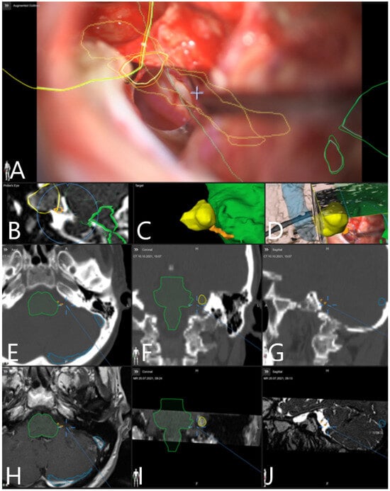 Patient No. 36, with left-sided AN and intact CN VII function. Patient underwent GTR of the tumor, and postoperative CN VII function was intact. (A) AR display on video screen with the outline of tumor (yellow), CN VII/VIII complex origin with course of CN VII at brain stem (orange) and brain stem (green). (B) Corresponding probe’s eye view. (C) Target view (tumor and further objects outside of the focus plane are visualized) and (D) overview video plane in relation to the 3D objects. (E) Navigation display with focus plane on the CN VII/VIII course with segmented objects (tumor outline in yellow, CN VII/VIII in orange, venous sinuses in blue) following craniotomy within CT mode in (E) axial, (F) coronar and (G) sagittal view as well as in (H) axial and (I) coronar T1-weighted post-contrast MRI and (J) sagittal view of T2-weighted MRI.