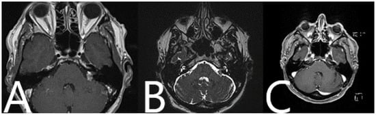 Patient No. 36. Preoperative (A) T1-weighted post-contrast and (B) T2-weighted MRI which shows a left-sided AN with contact to brain stem. (C) Postoperative T1-weighted post-contrast MRI shows complete resection of the tumor.