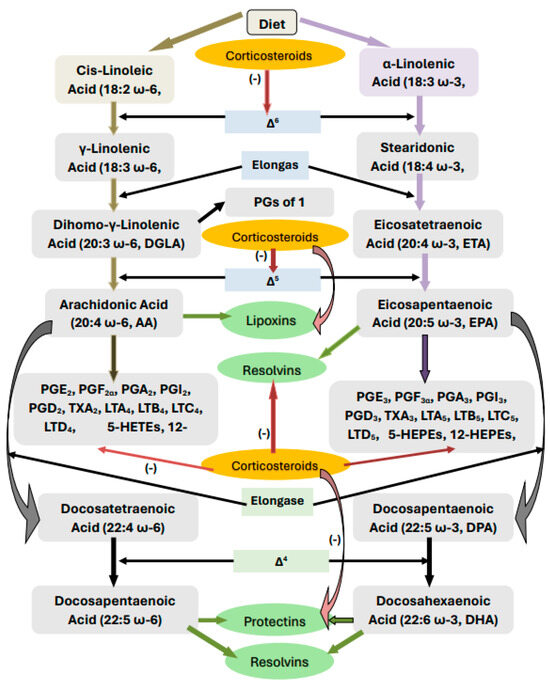 Dietary linoleic acid (c-LA, 18:2 n-6) and alpha-linolenic acid (ALA, 18:3 n-3) are essential fatty acids that are not formed in the body and, hence, must be obtained from diet. EFAs are essential for the integrity of skin and immune response and form precursors of several pro- and anti-inflammatory eicosanoids. EFAs are metabolized by enzymes desaturases (Δ6 and Δ5) and elongases to form their long-chain metabolites: gamma-linolenic acid (GLA, 18:3 n-6), dihomo-GLA (DGLA, 20:3 n-6), and arachidonic acid (AA, 20:4 n-6) from LA and eicosapentaenoic acid (EPA, 20:5 n-3) and docosahexaenoic acid (DHA, 22:6 n-3) from ALA. All these compounds are polyunsaturated fatty acids (PUFAs: LA, GLA, DGLA, AA, ALA, EPA, and DHA). DGLA is the precursor of prostaglandin E1 (PGE1), a potent platelet anti-aggregator; AA is the precursor of two series prostaglandins (PGs), thromboxanes (TXs), and four series leukotrienes (LTs) that have pro-inflammatory actions except for PGI2 (prostacyclin) that has platelet anti-aggregator and vasodilator and both pro- and anti-inflammatory actions. AA is also the precursor of anti-inflammatory, vasodilator, and platelet anti-aggregator molecule lipoxin A4 (LXA4). EPA is the precursor of 3-series PGs, TXs, and 5-series LTs that also possess pro-inflammatory actions but are much less potent compared to those derived from AA. In addition, anti-inflammatory compounds resolvins (RSVs) of the E series are derived from EPA. DHA does not form any PGs, LTs, and TXs but gives rise to potent anti-inflammatory compounds, resolvins of the D series, protectins, and maresins. Thus, PUFAs form precursors to both pro- and anti-inflammatory compounds. The balance between these pro- and anti-inflammatory compounds ultimately determines whether the inflammatory process continues or inflammation resolution occurs, leading to wound healing ([4,5,6,7,8,9,10] and Figure 1).