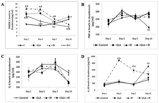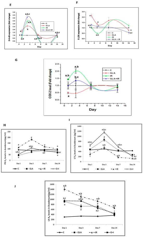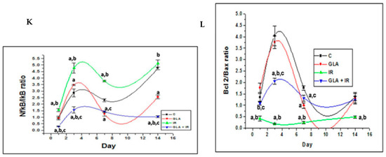 (A–D) Duodenal concentrations of cytokines HMGB1 (A), TNF-α (B), IL-6 (C), and IL-10 (D) by ELISA method. Mice were pre-treated with 100 µg/kg GLA at 48, 24, and 1 h prior to total-body irradiation of 7.5 Gy (at 1 Gy/min). Duodenum samples were obtained on day 1, day 3, day 7, and day 14 post-irradiation. All values are expressed as mean ± SEM (n = 3). Statistical significance was calculated using t-tests, and p-values < 0.05 are represented by a, b, c when compared to control, GLA, and irradiation, respectively. C, control; GLA, gamma-linolenic acid; IR, irradiation (7.5 Gy). (E–G) Effect of GLA and irradiation on genes associated with PUFA metabolism in duodenum tissue on day 1, day 3, day 7, and day 14. Values (n = 3) expressed as mean ± SEM. a, b, c were significant (p < 0.01) when compared with control, GLA, and irradiation, respectively. (H–J) Estimation of PUFA metabolite PG E2, LTE4, and LXA4 levels. Mice were pre-treated with 100 μg/kg GLA at 48, 24, and 1 h prior to irradiation and were subjected to total-body irradiation of 7.5 Gy (at 1 Gy/min). Duodenum samples were obtained on day 1, day 3, day 7, and day 14 post-irradiation. All the values are expressed as mean ± SEM (n = 3). Statistical significance was calculated using t-tests, and p-values < 0.001 are represented by a, b, c when compared to control, GLA, and IR, respectively. C, control; GLA, gamma-linolenic acid; IR, irradiation (7.5 Gy). (K,L): Effect of GLA and radiation on the expression of NF-kB/IkB in duodenal tissue of mice on days 1, 3, 7, and 14. All values (n = 3) are expressed as mean ± SEM. a, b, c were significant (p < 0.01) when compared with control, GLA, and IR, respectively. C, control; GLA, gamma-linolenic acid; IR, irradiation (7.5 Gy). Genes associated with Apoptotic Pathway Radiation are known to cause apoptosis/cell death. Hence, we studied their effect on the expression of genes associated with apoptosis and cell survival. Our results show that IR caused a significant (p < 0.01) decrease in the Bcl-2/Bax ratio on all days (1, 3, 7, and 14) of the study compared to the control. This indicates a significant degree of cell death in the duodenum tissues. In contrast to this, GLA + IR-treated mice showed a significantly (p < 0.01) higher Bcl-2/Bax ratio, indicating improved survival of cells against irradiation-induced insult at all time points. These data (this figure) are taken from reference [28].