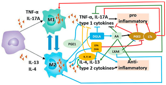 Scheme showing actions of M1 and M2 macrophages and cytokines produced by them. DGLA, AA, EPA, and DHA are anti-inflammatory in nature and suppress the production of TNF-α, IL-2, and IL-1 and facilitate M2 macrophages generation. PGE1 from DGLA and LXA4 from AA, resolvins (R) of E series from EPA and E series from DHA. Protectins (P) and maresins (M) from DHA are anti-inflammatory. Resolvins, protectins, and maresins suppress TNF, IL-1, IL-2. PGE2 production. Leukotrienes of B4, D4, and E4 series from AA are pro-inflammatory. Leukotrienes of 5 series are from EPA and are less pro-inflammatory compared to leukotrienes of 4 series. LXA4, resolvins, protectins, and maresins inhibit PGE2 and LTs production. EPA and DHA inhibit PGE2 production. This figure is taken from reference [34].