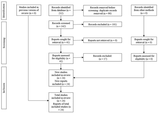 The electronic search of the database yielded 232 articles, of which 142 remained following the elimination of duplicates. During phase 1, the titles and abstracts of the identified studies were reviewed, resulting in 41 articles deemed suitable for full-text assessment. Finally, 24 SRs were retained for qualitative analysis. The rationales for excluding articles are detailed in Table 2. The complete process of study identification and selection is depicted in Figure 1.