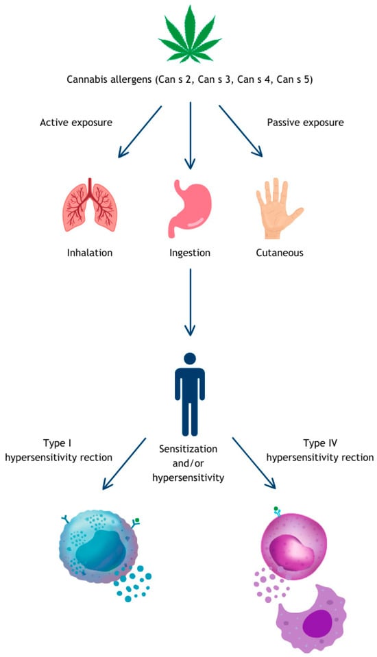 Most cannabis hypersensitivity reactions are mediated by an allergic mechanism, either type 1 or type 4 []. Symptoms of cannabis allergy or hypersensitivity may result from different routes of exposure – Figure 1. These facts justify investigation of a possible relationship between cannabis sensitization and diseases such as asthma, allergic rhinitis, or atopic dermatitis.