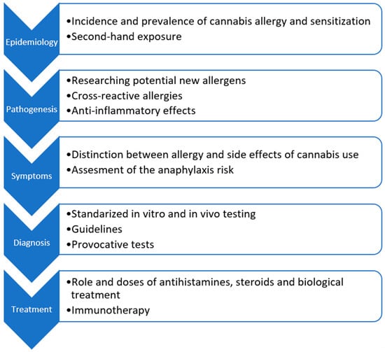 We presented six different patients with sensitization to cannabis and/or the main sensitizing protein, Can s 3. They became the basis for creating the current literature review, where most of the studies had been published less than 5 years ago. As presented in Figure 2, we identify and suggest possible future directions of research on cannabis allergy and sensitization. Starting with the epidemiological issues, we emphasize that the problem of sensitization to cannabis allergens in the population may be broader than it first appears, so it is essential to propagate in commercial testing the availability of not only the entire cannabis allergen extract but also the individual components. Recent studies have shown that there are new components in addition to Can s 3 that can cross-react with other allergens, as in the case of Can s 5 and Can s 2. Thus, we moved on to aspects of the pathogenesis of cannabis allergy, where we pointed out that it is a complex allergy, also based on cross-reactions. We also raised the discussion of cannabinoid receptors in the context of THC and CBD, which may hint at their dualistic nature of function. Of note, although sensitization to cannabis occurs in AD patients, topical use of cannabinoids may have anti-inflammatory effects. Symptoms involving multiple systems that have been widely described in the literature as well as in this review were summarized in the form of tables. Their widespread influence is noteworthy, ranging from local reactions to an anaphylactic shock ending tragically. In the context of diagnosis, although sIgE for cannabis allergens can be detected, there is a lack of broader validation of further diagnostic methods commonly used in clinical practice such as SPT or challenge tests. Interestingly, they have already been described in the literature for a relatively long time, such as the bronchial challenge in 1991. We believe that a holistic view of the topic and creating bullet points of future directions can encourage researchers and clinicians to lean into this issue.