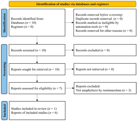 This study was approved by the Institutional Review Board of Konkuk University Medical Center (Seoul, Korea; approval no. 2023-10-002; Chairperson: Prof. Sang Heon Lee) on 6 October 2023. Research articles retrieved from PubMed on 26 May 2023, using the English keywords ‘remimazolam AND anaphylaxis’ without any filters applied were evaluated. The inclusion criteria were that (1) the entire paper had to be written in English, ensuring that all the included studies could be thoroughly evaluated and understood by the research team without language barriers and (2) the studies aligned with the criteria for anaphylaxis according to the World Allergy Organization (WAO). The WAO criteria apply when symptoms involving the skin or mucosal tissues occur along with concurrent respiratory distress, reduced blood pressure (BP), or severe gastrointestinal symptoms, or when a patient exhibits allergic symptoms after exposure to an allergen, even in the absence of typical skin involvement, and experiences hypotension, bronchospasm, or laryngeal involvement [23]. Exclusion criteria were any studies not meeting these inclusion criteria, specifically those not written in English or not aligning with the WAO anaphylaxis criteria. All published articles up to the search date were included without any date restrictions. The confirmed data were used to conduct a systematic review according to the Preferred Reporting Items for Systematic Reviews and Meta-Analyses (PRISMA) 2020 guidelines.
