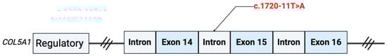 - Symoens, S.; Malfait, F.; Vlummens, P.; Hermanns-Lê, T.; Syx, D.; De Paepe, A. A Novel Splice Variant in the N-propeptide of COL5A1 Causes an EDS Phenotype with Severe Kyphoscoliosis and Eye Involvement. PLoS ONE 2011, 6, e20121. [Google Scholar] [CrossRef] [PubMed]