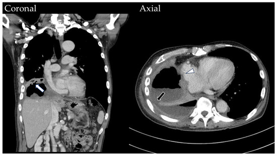 The contrast-enhanced CT scan reveals a tumor-to-bronchial fistula (white arrow) causing air accumulation on the coronal view. On the axial view, focal thinning of the cardiac wall (white arrowhead) and a persistent diaphragmatic defect (black arrow) over the posterolateral aspect are depicted.