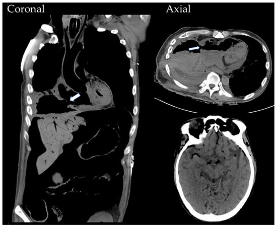The emergent whole-body CT scan reveals a ruptured right atrium (white arrows) forming a bronchial-to-tumor-to-cardiac fistula. Massive air emboli are scattered in the cardiac chambers, great vessels, intracranial vessels, and pneumoperitoneum.