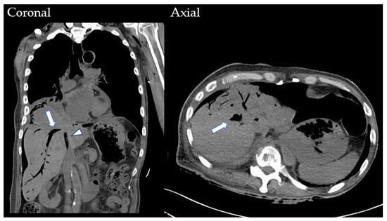 - Mandal, A.; Sen, S.; Baig, S.J. Bronchobiliary fistula. J. Minimal Access Surg. 2008, 4, 111–113. [Google Scholar]