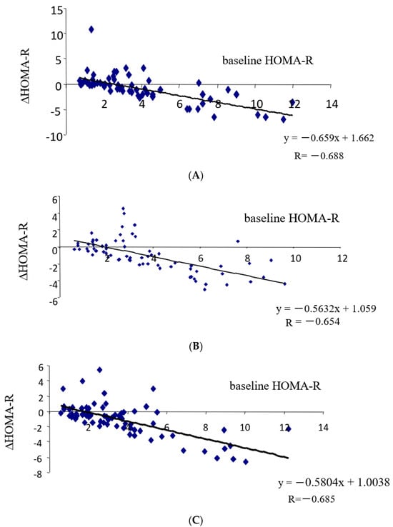 All three therapeutic strategies demonstrated a baseline-dependent regulation of insulin resistance, as illustrated in Figure 1A–C. After dividing subjects based on the median changes in HOMA-R values (ΔHOMA-R), group X (lower ΔHOMA-R) displayed a decrease, while group Y (higher ΔHOMA-R) exhibited an increase in HOMA-R (Table 6(AX,AY,BX,BY,CX,CY)). It is noteworthy that baseline HOMA-R was significantly higher in group X compared to group Y in each treatment group (results not presented in the table). These findings suggest that high baseline insulin resistance decreases while low baseline insulin resistance increases with each therapeutic approach. An intriguing observation is the substantial proportion of the population displaying an increase in insulin resistance. In this study, we investigated the changes in various diabetic parameters based on alterations in insulin resistance.