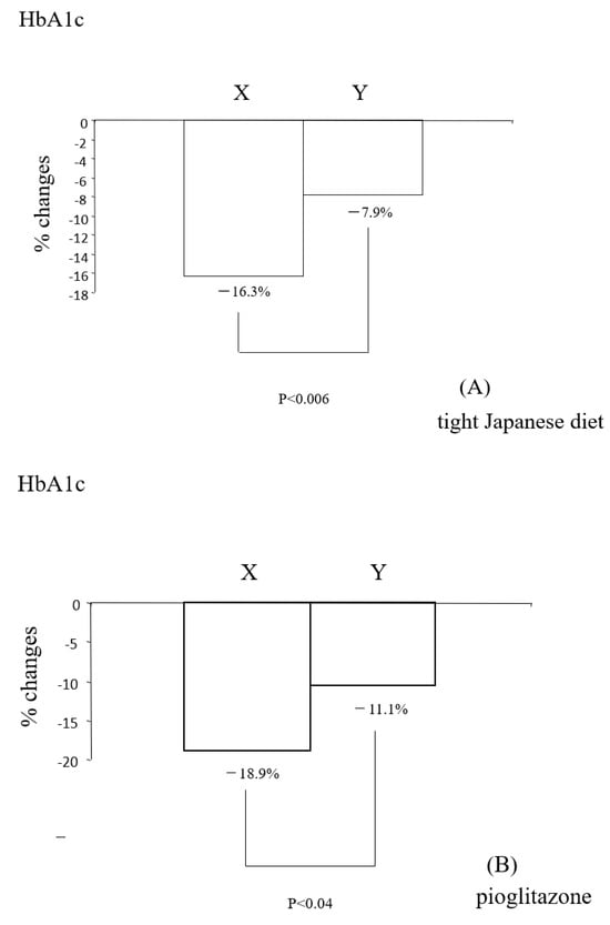 Under the tight Japanese diet (X/Y = 33/32), comparable reductions in BMI were observed in both groups (Table 6(AX,AY)). In group X (Table 6(AX)), significant decreases were seen in HOMA-R, FBG, HbA1c, non-HDL-C, and insulin, while significant increases were observed in UA. T-C displayed a tendency to decrease. In group Y (Table 6(AY)), significant decreases were seen in HbA1c (not FBG), while significant increases were observed in HOMA-R, HOMA-B, and insulin. Significant inter-group differences were seen in the changes in HbA1c (greater reductions in group X versus Y, Figure 2A).