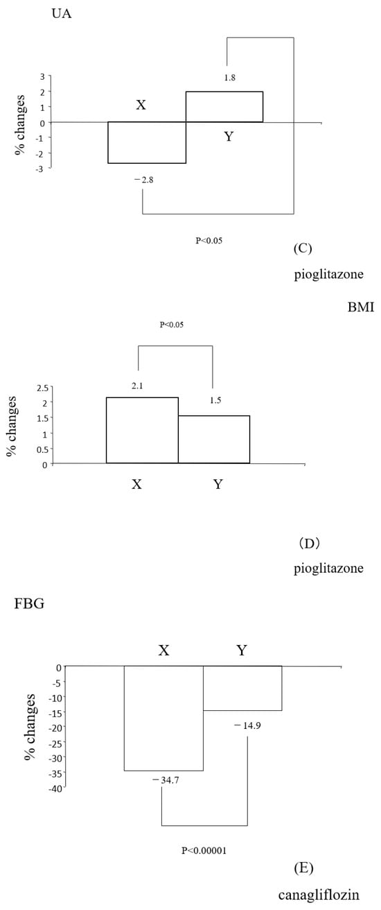 With pioglitazone (X/Y = 35/35), in group X (Table 6(BX)), significant decreases were observed in HOMA-R, FBG, HbA1c, insulin, TG, and TG/HDL-C, while significant increases were seen in HOMA-B, HDL-C, and BMI. Non-HDL-C exhibited a tendency to decrease. In group Y (Table 6(BY)), significant decreases were observed in HbA1c (not FBG), while significant increases were seen in HOMA-R, HOMA-B, HDL-C, BMI, and insulin. T-C displayed a tendency to increase in this group. Significant inter-group differences were observed in the changes in HbA1c and UA (greater reductions in group X versus group Y, Figure 2B,C) and BMI (greater increases in group X versus group Y, Figure 2D).