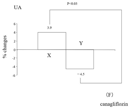 With canagliflozin (X/Y = 39/38), in group X (Table 6(CX)), significant decreases were observed in HOMA-R, FBG, HbA1c, insulin, TG, TG/HDL-C, and BMI. In group Y (Table 6(CY)), significant decreases were observed in FBG, HbA1c, and BMI, while significant increases were seen in HOMA-R, insulin, and HOMA-B. UA exhibited a tendency to decrease. Significant inter-group differences were observed in the changes in FBG (greater reductions in group X versus Y, Figure 2E) and UA (greater reductions in group Y versus X, Figure 2F). No inter-group differences were noted in the changes in HbA1c or BMI between these two groups (Table 6(CX,CY))