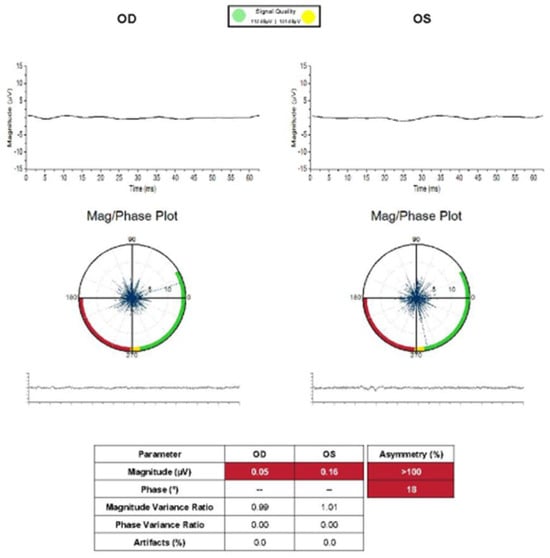 30−Flicker electroretinogram (ERG) findings at the initial outpatient visit. Waveforms were flat in both eyes without a flicker response.