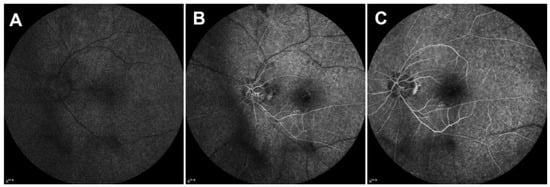 Fluorescein angiography (FA) findings at the initial outpatient visit. (A) Choroidal phase: 28 s; (B) arterial phase: 34 s; (C) venous phase: 44 s. Fluorescein angiography (FA) demonstrated significant delayed filling of the choroidal and arterial circulation and the abnormal delayed drainage of venous circulation in the inferior arcade. Multiple narrowed retinal arteries were observed, although there was no evidence of arterial obstruction.