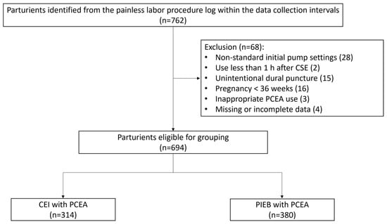 Flowchart of parturient selection. CEI, continuous epidural infusion; CSE, combined spinal–epidural analgesia; PCEA, patient-controlled epidural analgesia; PIEB, programmed intermittent epidural bolus.