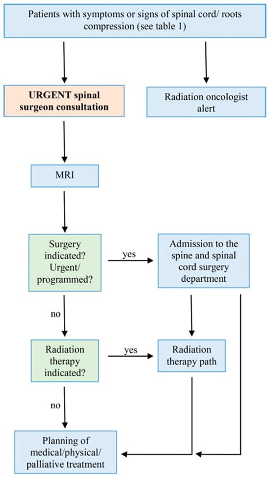 - Rispoli, R.; Reverberi, C.; Targato, G.; D’Agostini, S.; Fasola, G.; Trovò, M.; Calci, M.; Fanin, R.; Cappelletto, B. Multidisciplinary Approach to Patients with Metastatic Spinal Cord Compression: A Diagnostic Therapeutic Algorithm to Improve the Neurological Outcome. Front. Oncol. 2022, 12, 902928. [Google Scholar] [CrossRef]
