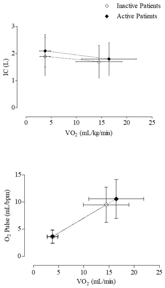 Mean and standard deviation values at rest and peak of the inspiratory capacity (upper panel) and O2Pulse (lower panel) in relation to the corresponding rest and peak VO2 values in 83 active and in 131 inactive patients with COPD. Mean IC values at rest and at peak of exercise did not differ between active and inactive patients, whereas mean O2Pulse and VO2 values were significantly higher at peak of exercise (p < 0.01), but not at rest in active patients as compared to inactive ones.