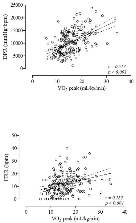 The oxygen pulse (O2Pulse) at peak, the double product reserve (DPR) and the heart rate recovery at peak of exercise (HRR) reflect the cardiovascular response to exercise. O2Pulse (mL/bpm) was calculated by dividing instantaneous oxygen uptake by the heart rate []. As described by Le VV et al. [], we calculated DPR (mmHg·bpm) by subtracting the double product, i.e., the product of systolic blood pressure and heart rate, at maximal exercise minus that at rest. HRR (bpm) was defined as the reduction in the HR from the peak exercise level to the rate 1 min after the end of exercise [].