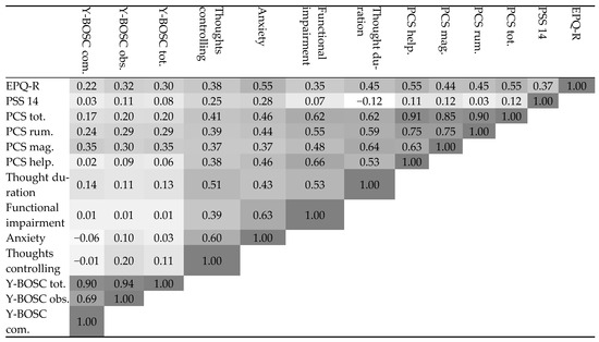 Pearson correlations summary in the group of fibromyalgia and obsessive compulsive symptoms (OCS). The darker the cell color, the more statistically significant it is (p < 0.05). Cell darkness indicates higher significance. Abbreviations: PSS14—Perceived Stress Scale questionnaire, PCS—Pain Catastrophizing Scale, PCS.tot = PCS questionnaire total score, PCS.rum = PCS rumination component score, PCS.mag = PCS magnification component score, PCS.help = PCS helplessness component score, Y.BOSC.TOT = Y.BOSC questionnaire total score for evaluating OCD severity, Y.BOSC.obs = Y.BOSC obsession component, Y.BOSC.com—Y.BOSC compulsion component.