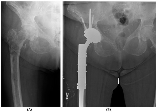 - Harrington, K.D. The management of acetabular insufficiency secondary to metastatic malignant disease. J. Bone Jt. Surg. Am. 1981, 63, 653–664. [Google Scholar] [CrossRef]
